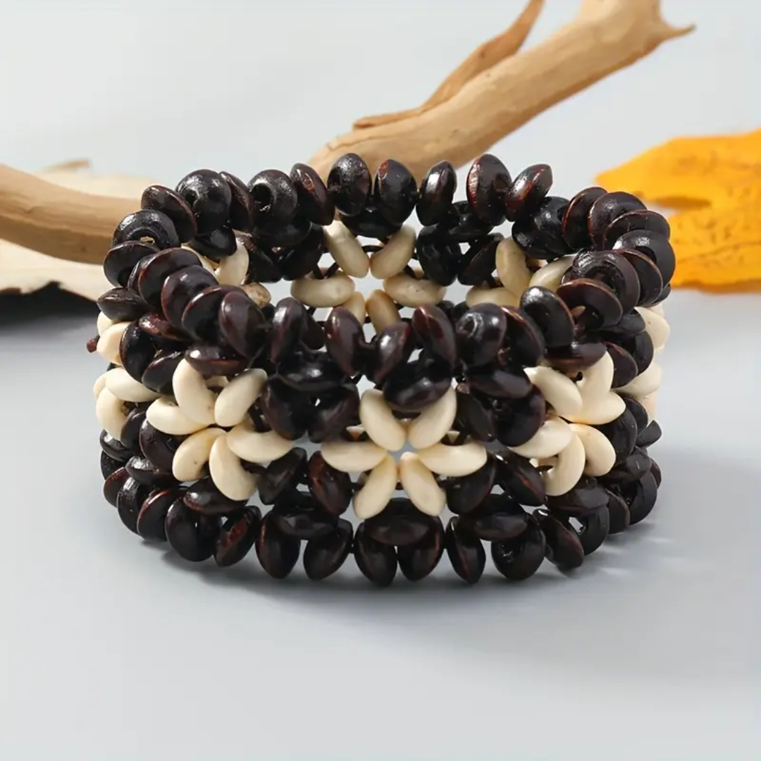 この手作りのブレスレットは、ダークブラウンとアイボリートーンのココナッツビーズが交互に組み合わされ、有機的で力強い花をイメージしたパターンに織り込まれています。その大胆な存在感は、ステートメントアクセサリーであり、精神的な仲間でもあります。
